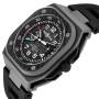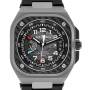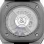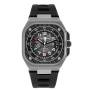 Case: Titanium square case 41.0 mm in diameter. Transparent exhibition sapphire case-back with oscillating weight. Bell & Ross logo on the shouldered crown.