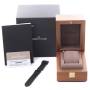 Dial: 1. Gray-blue sunray dial with applied index hour markers and Dauphine hands. Blue railway-style perimeter minute track. 2. A transparent exhibition sapphire crystal open-worked reverse of fascinating complexity reveals the mechanism of the retrograde chronograph.