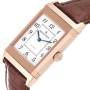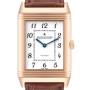 Replica Jaeger LeCoultre Grande Reverso Email Rose Gold Mens Watch 273.2.62 Q3732523. Manual winding movement. Power reserve of approximately 45 hours. 18k rose gold rectangular rotating case 48.5 x 30 mm. Case flips over to reveal a blank solid caseback. 18k rose gold ribbed bezel. Scratch resistant sapphire crystal. White dial with Arabic numerals and minute markers around an inner ring. Blued steel sword-shaped hands. Brown alligator leather strap with 18k rose gold tang buckle.