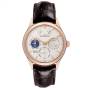 Dial: Silver dial with index hour markers. Date sub-dial located at 3 o'clock, Month indicator at 6 o'clock, day of the week and moonphase indicator at 9, and power reserve located at 12 o'clock. Year window between 7 and 8 o'clock.