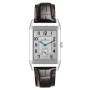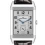 Replica Jaeger LeCoultre Reverso Duo Day Night Steel Watch 215.8.D4 Q3848420. Manual winding movement. Stainless steel five-body 47 mm x 28.3 mm rectangular rotating case. Stainless steel reeded bezel. Scratch resistant sapphire crystal. (1) Silver dial with black Arabic numerals. Rectangular subsidiary small seconds dial is at the 6 o'clock position. Blued steel hands. (2) Black guilloche Velvety Clous de Paris dial with steel indexes on a plain reserve. The upper sub-dial indicates the additional time-zone. A synchronoized 24 hour sub-dial at the 6 o'clock hour position. Polished luminous hands. Index hour markers and a fine printed minute track. Black leather strap with stainless steel double deployant clasp.