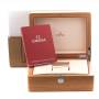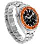 Case: Stainless steel round case 45.5 mm in diameter. Helium escape valve at the 10 o'clock position. Transparent exhibition sapphire crystal caseback. Two pushers operate the chronograph function. Omega logo on the crown.
