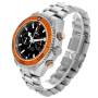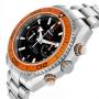 Dial: Black dial with luminescent index hour markers and broad arrow hands. Orange Arabic numeral at 12. Date calendar window at 6 o'clock aperture. Small seconds subdial at 9 o'clock, and a central orange-tipped chronograph hand. Chronograph subdial at 3 o'clock to measure both hours and minutes.