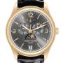 Dial: Slate grey dial with luminescent yellow gold baton hour markers and feuille hands. Raised Arabic numerals at 3, 9, and 12 o'clock. Center sweep seconds hand. Two subdials displaying month and day. Date aperture at 6 o'clock. Fan form sector for the moon phase. Power reserve indicator at 12 o'clock.