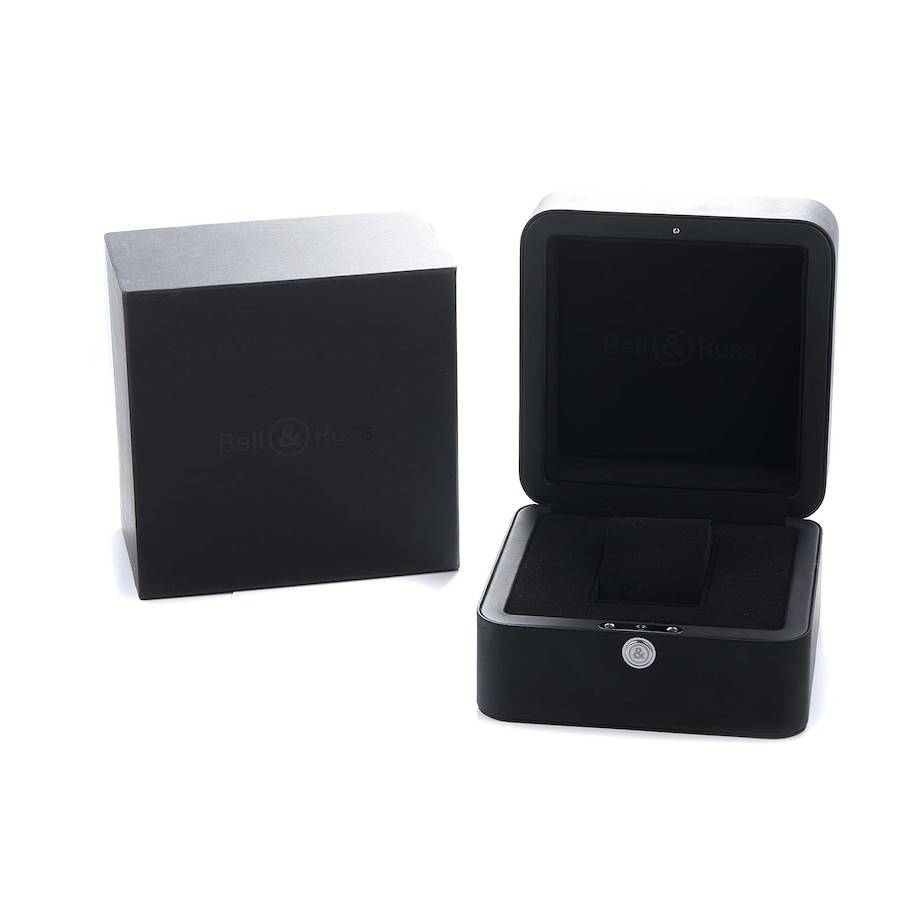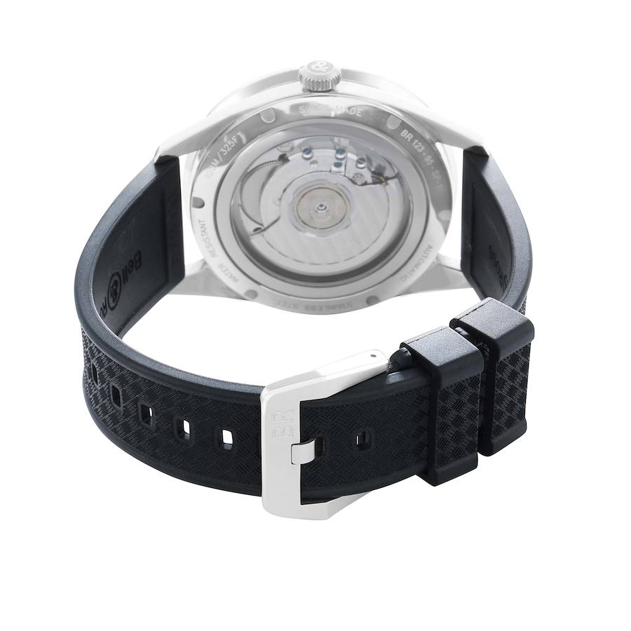 Case: Stainless steel round case 43.0 mm in diameter. Transparent exhibition sapphire crystal case back. Bell & Ross logo on the crown.
