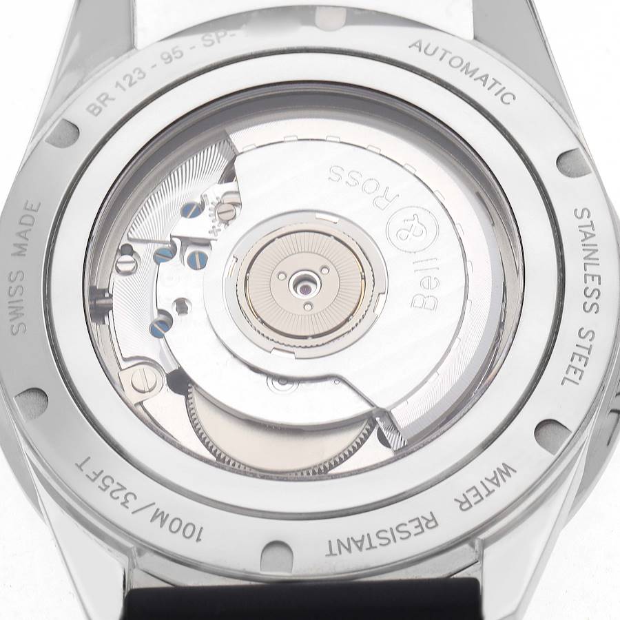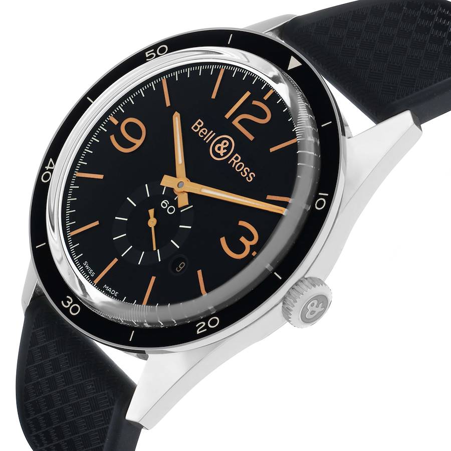Replica Bell & Ross Sport Vintage Steel Black Dial Mens Watch BR123. Automatic self-winding movement. Stainless steel round case 43.0 mm in diameter. Transparent exhibition sapphire crystal case back. Bell & Ross logo on the crown. Black ceramic bezel with 0-60 scale. Scratch resistant sapphire crystal. Black dial with index hour markers and Arabic numerals at 3, 9, and 12. Luminescent hands. Date window between 4 and 5 o'clock. Sub-dial at 6 o'clock. Black ceramic bezel with 0-60 scale.