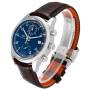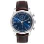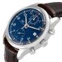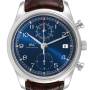 Dial: Blue sunray dial with raised silver Arabic numerals. Silver leaf shaped steel hands. Blue subdials at 6 and 12 o'clock with running seconds and chronograph minute counter respectively. Date aperture at 3 o'clock.