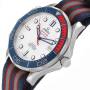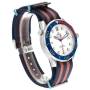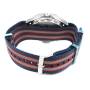 Bracelet: Red and blue fabric NATO strap with a stainless steel tang buckle.